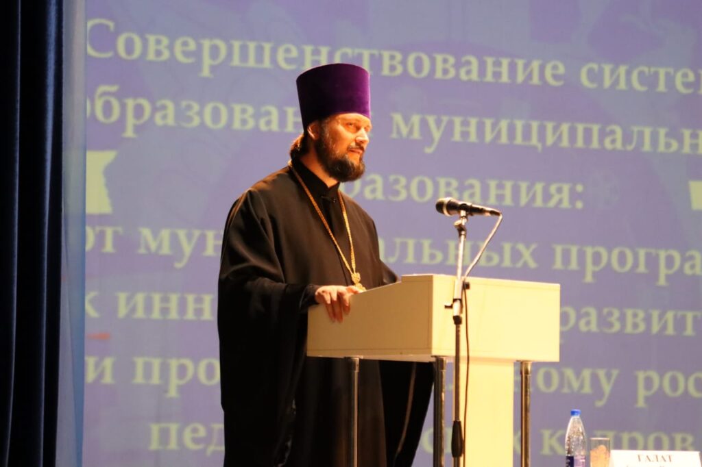 Благочинный Брюховецкого церковного округа, настоятель храма святых апостолов Петра и Павла ст. Брюховецкой протоиерей Родион Драпов в своем выступлении поздравил присутствующих с двунадесятым праздником Успения Пресвятой Богородицы и Приснодевы Марии и пожелал педагогам телесных сил, терпения, мудрости, чтобы учителя оставались добрым примером для детей. Опираясь на формулировки Федерального закона «Об образовании в Российской Федерации» и высказывания русских святителей, священнослужитель раскрыл роль учителя в духовно-нравственном образовании и воспитании обучающихся. Задача учителя заключается не только в том, чтобы давать определенный объём знаний, но и формировать целостный образ ребенка. Задача Церкви заключается в формировании образа Божия внутри человека. В заключение своего выступления отец Родион подчеркнул, что все участники образовательного процесса: и педагоги, и родители, — должны формировать своим примером терпения и любви тот образ, который будет запечатлён в душе ученика, поэтому каждый из присутствующих в зале должен стать тем духовным наставником, который ведёт детей к Богу.